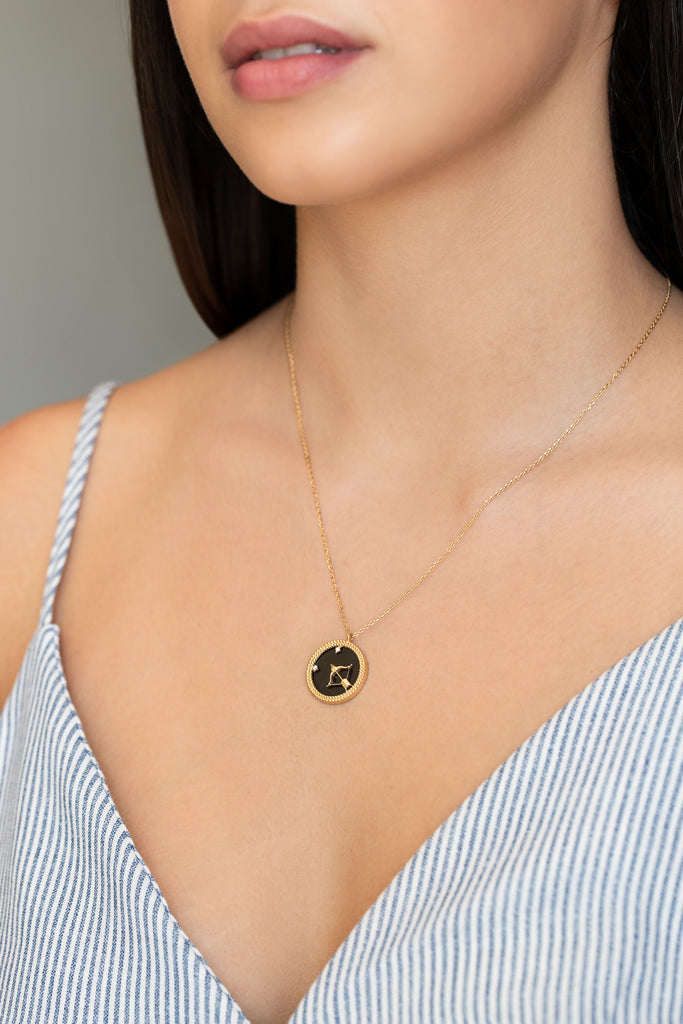 A Zodiac necklace is a unique and personalized piece of jewelry that captures the essence of one's astrological sign . This piece is Handcrafted from 18k gold , adorned with diamonds and hand carved Onyx. Energy Muse collection is inspired by the power of healing stones ,it incorporates the energy, colors, and properties associated with various gemstones and crystals.