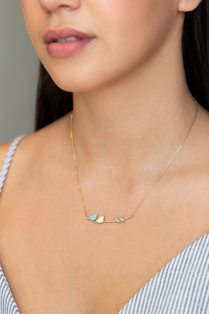 This exquisite necklace depicts a handcrafted 18k gold branch and birds hand carved with Turquoise and Mother of pearl representing parents and their two offsprings. Fly with love collection narrates the beautiful tale of unconditional family love , it is a memorable piece that is truly distinguished .