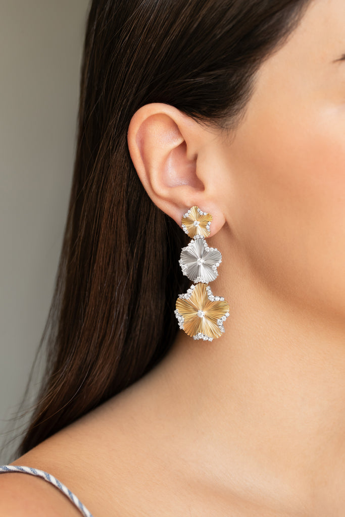 This outstanding design features three Alektra flowers dangling earrings , double toned in yellow and white gold , influenced by intricate gold patterns which mirror the radiant rays of sunlight embellished with luminous natural diamonds. The meticulous detail and craftsmanship reflect the luminosity and shine of yellow gold and diamonds. These distinctive pieces can be passed down from generation to generation due to their timeless designs and exquisite craftsmanship.